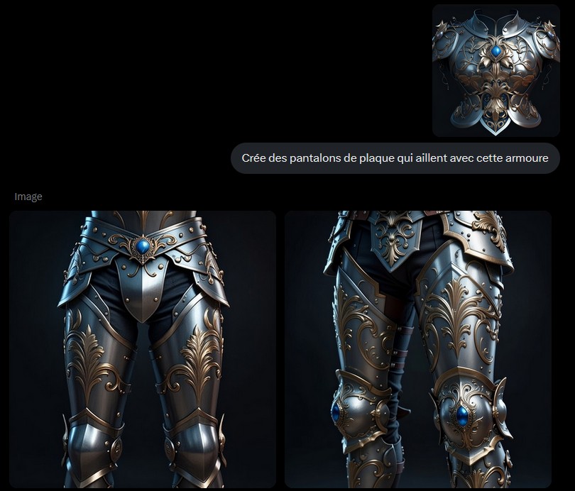 J’ai demandé à Grok, puisqu’on en dit tant de bien, de me générer des jambières de plaques qui aillent avec une vieille création de Midjourney, avec un prompt plus qu’approximatif. Ça donne ça :